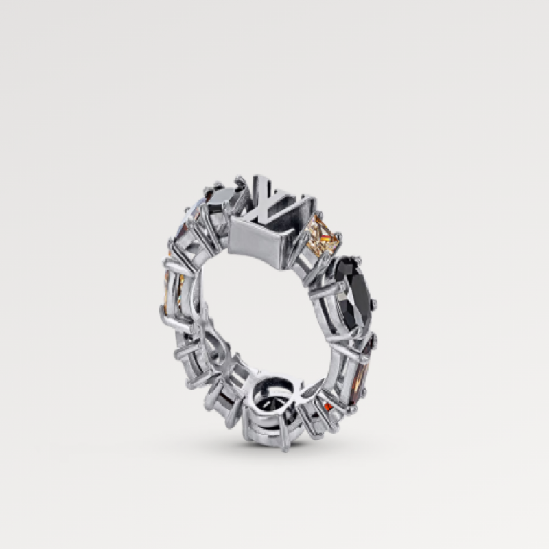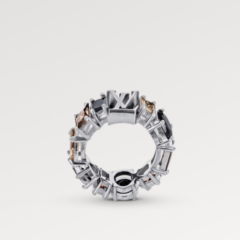 LV Light戒指擁有金屬的沉穩格調,以手工鑲嵌的圓形切割鋯石簇擁中央LV圖案。 矚目尺寸彰顯俊朗格調,與當季成服系列相得益彰。