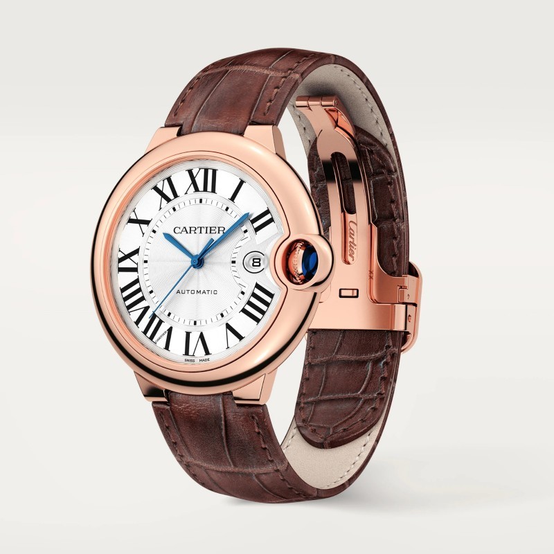 《男士》42毫米,自動機芯,玫瑰金,皮革Ballon Bleu de Cartier 腕錶,42 毫米。自動上鍊機械機芯,1847 MC 型機芯。750/1000 玫瑰金錶殼,凹槽表冠鑲嵌一顆凸圓形藍寶石,銀色扭索飾紋漆面乳白色錶盤。藍鋼劍形指針。藍寶石水晶。棕色鱷魚皮錶帶,玫瑰金 750/1000 可互換展開扣。3 點鐘位置設有日曆視窗。厚度:13 毫米。防水高達 3 巴(約 30 米/100 英尺)。