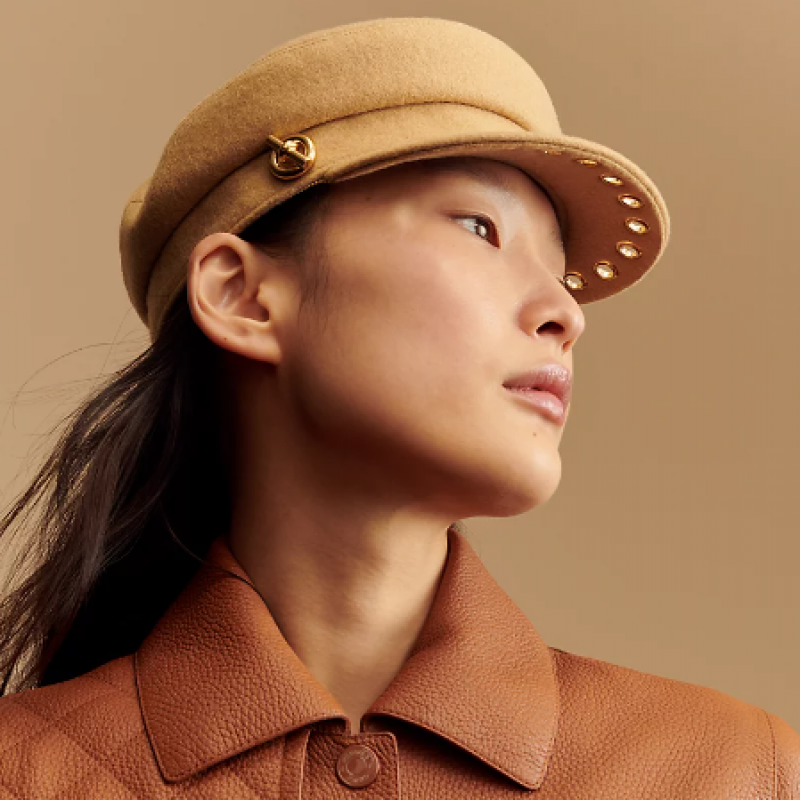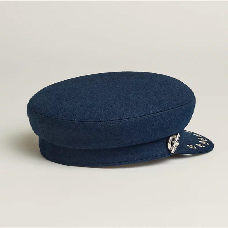 輕盈海軍絨面呢女士便帽,鏤孔帽舌配有雙金屬孔眼,內側飾有「Hermès Ancre」徽章。側邊飾有Chaine d'Ancre細節。純色真絲和人造絲內襯。側邊飾有Chaine d'Ancre細節。法國製造。
