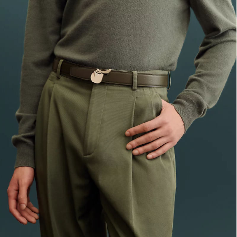 鍍鈀金屬皮帶扣。這款皮帶扣的設計靈感源自Cavale馬鞍,以此向品牌的馬術根源致意。法國製造。& Box 135和Togo小牛皮雙面皮腰帶。法國製造。
