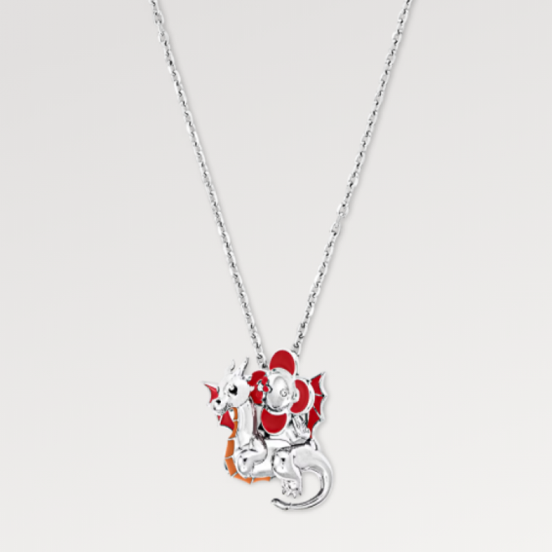 LV Dragon項鍊匠心雕琢Vivienne乘駕祥龍的吊墜設計,以鉸接羽翼塑造振翅高飛之姿,與LV字母裝潢共同連於可調節鏈條,可為摯愛著裝注入盎然意趣,成就品牌擁躉的新春佳禮。